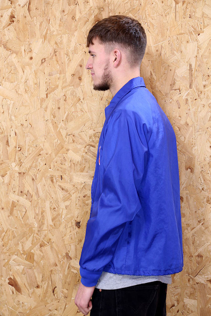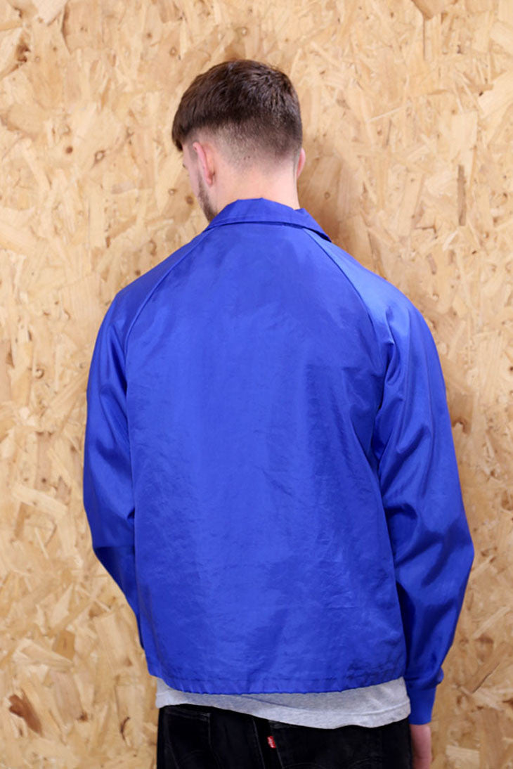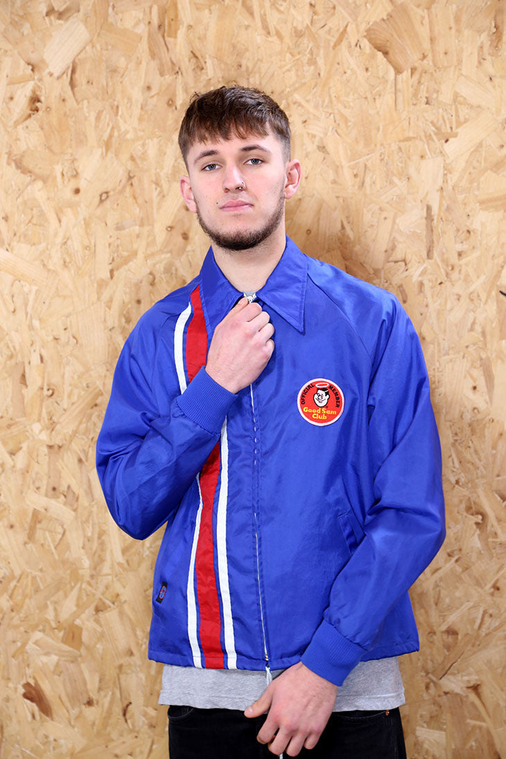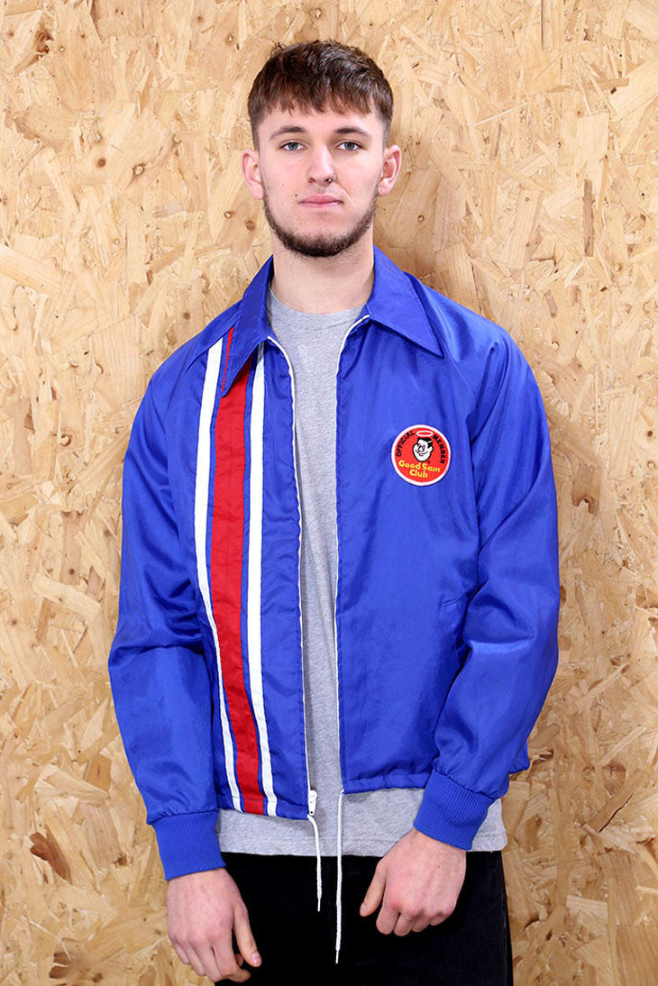 Retro coach jacket for the ‘Good sam Club’. this blue vintage piece features a 70s style collar, red and white stripes and membership badge on the front, white zipper fastenings, pockets and drawstring hem.