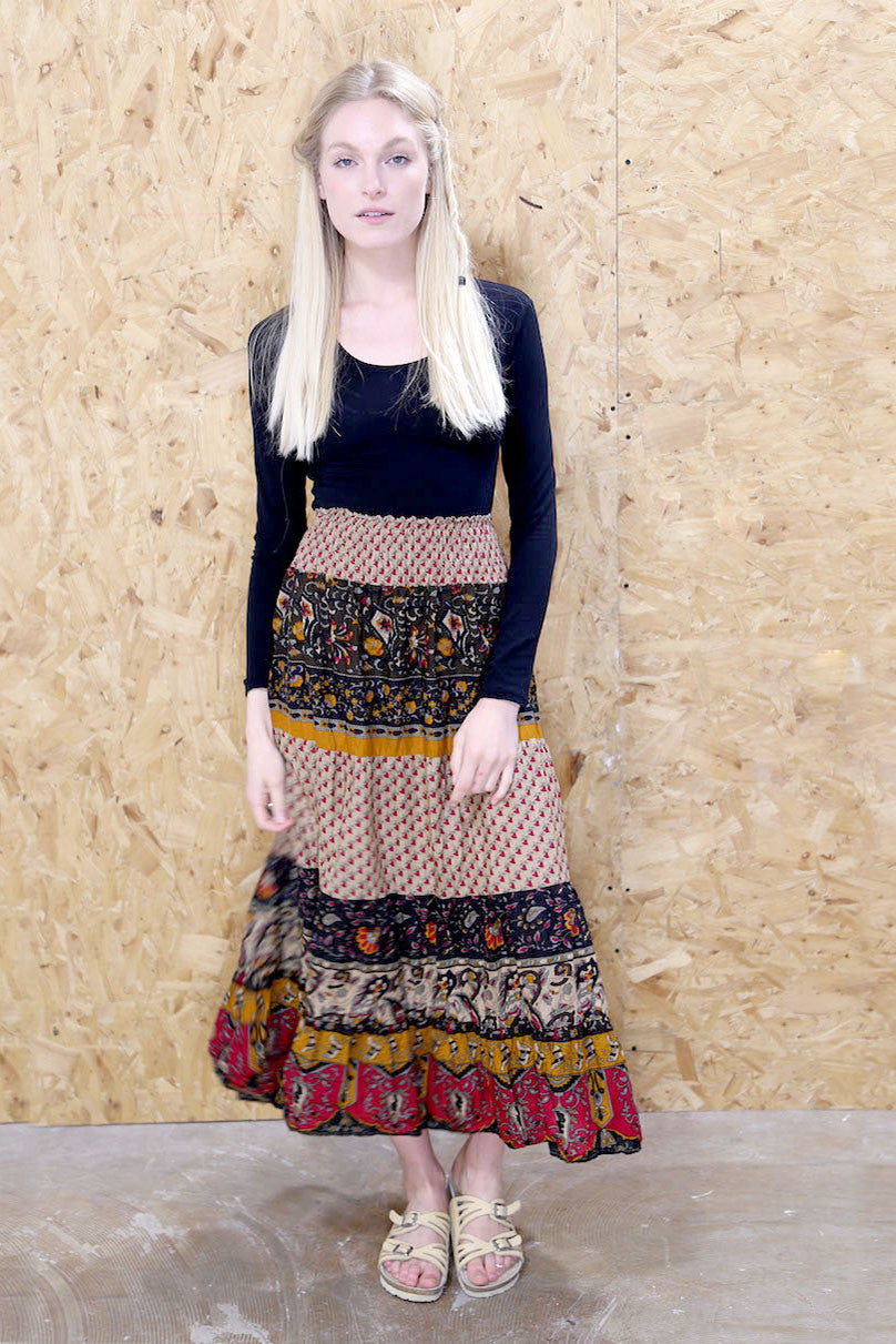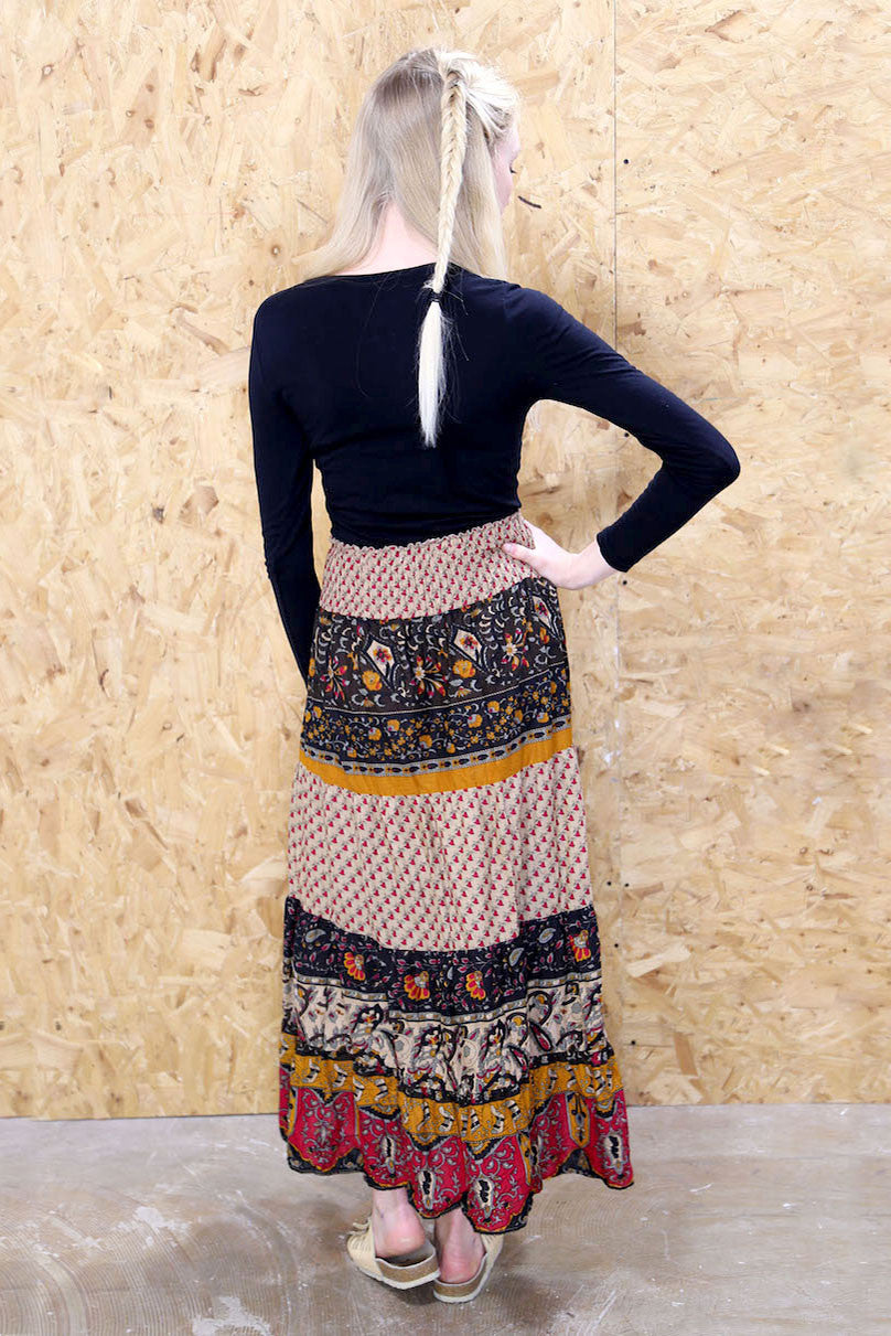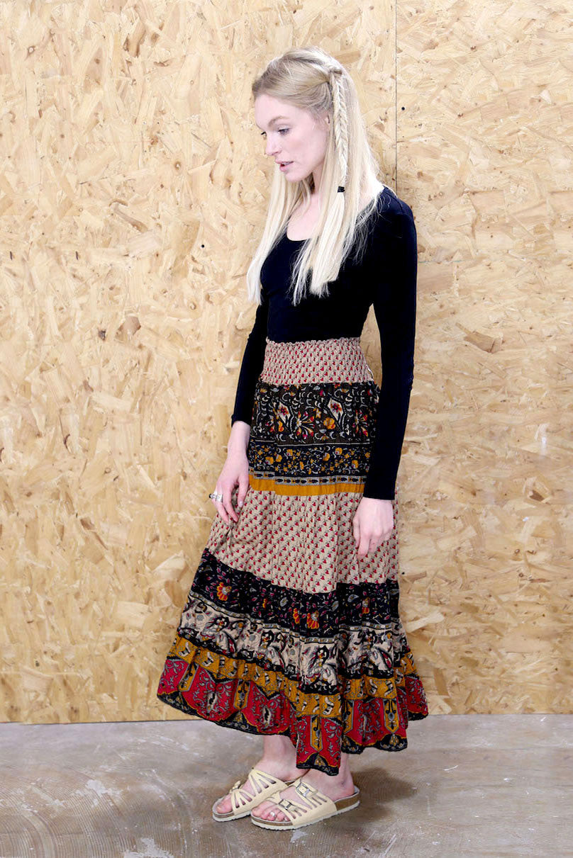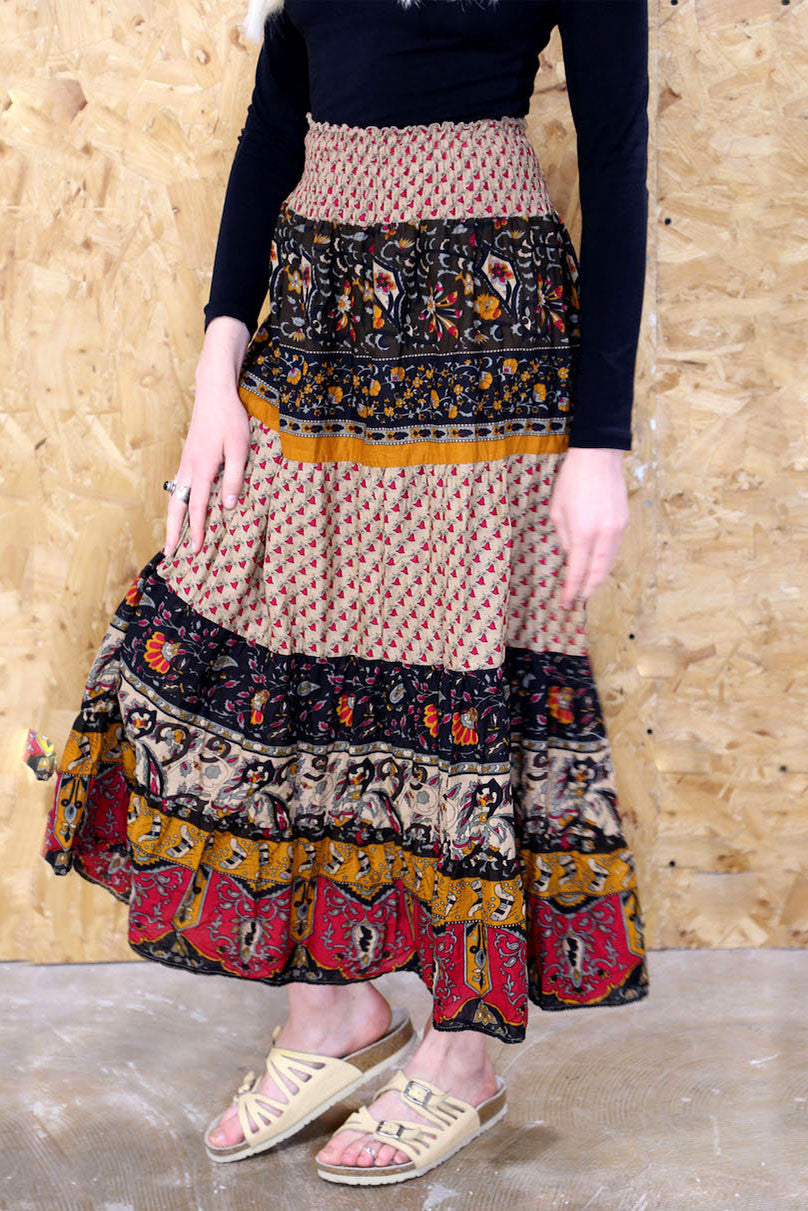Full length high waisted skirt in panels of bohemian style prints in earthy colours, features an elasticated waist.