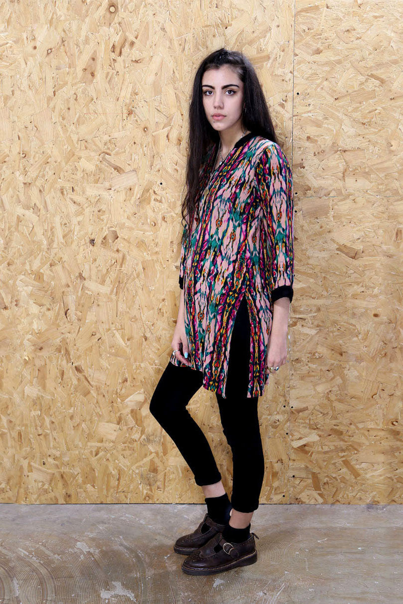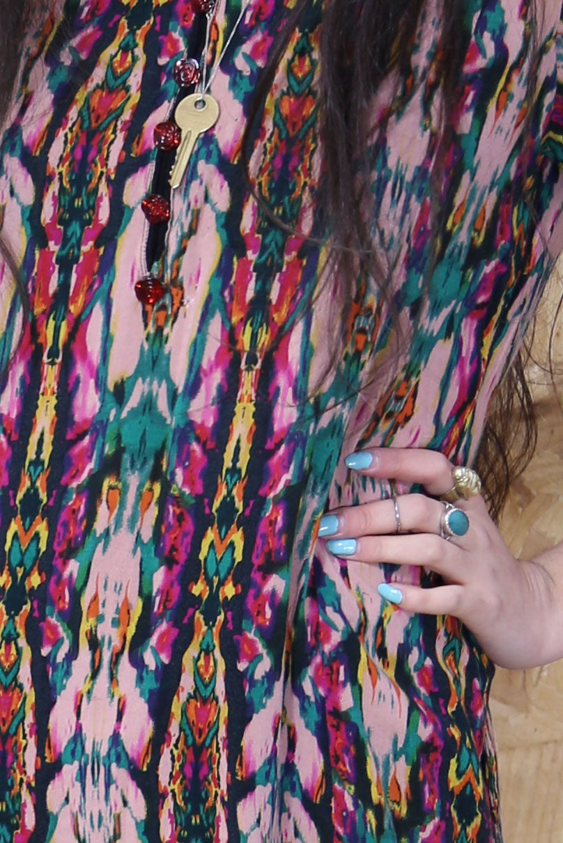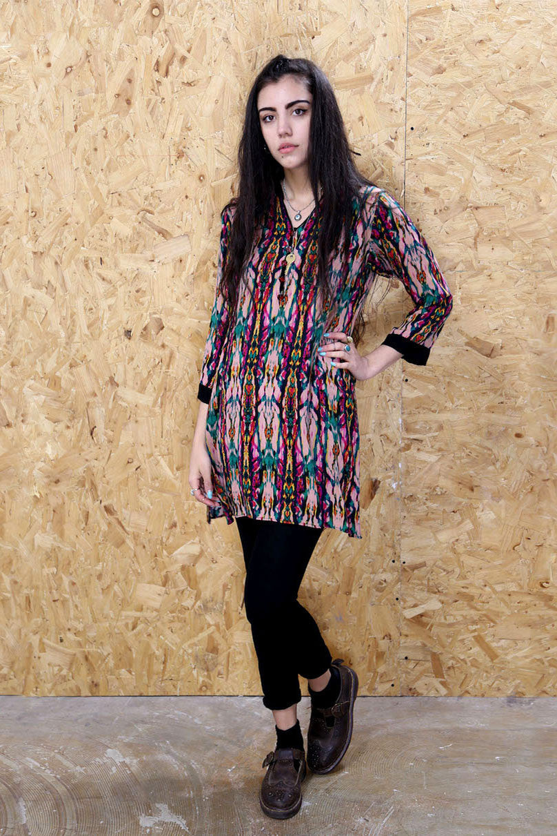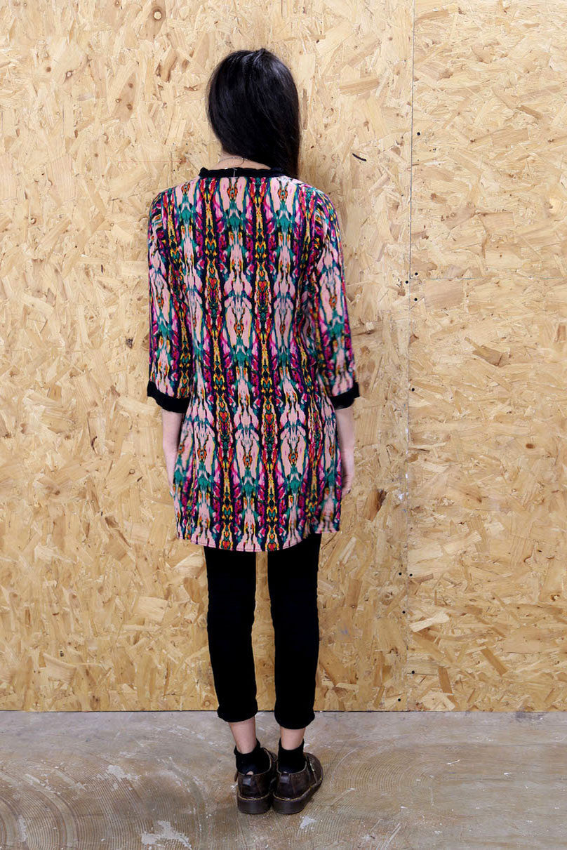 Bohemian tunic in all over print, features 3/4 length sleeves, side slits and clear red buttons at the neck.