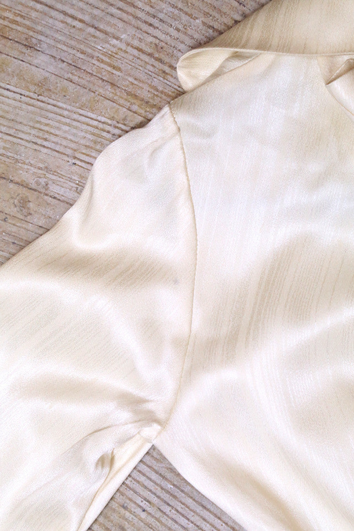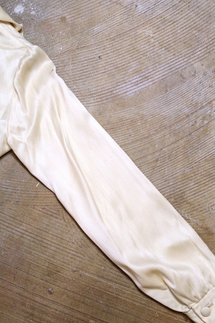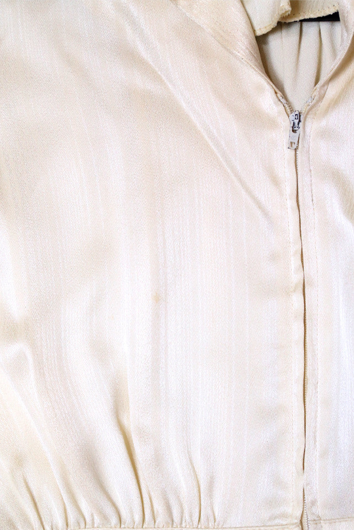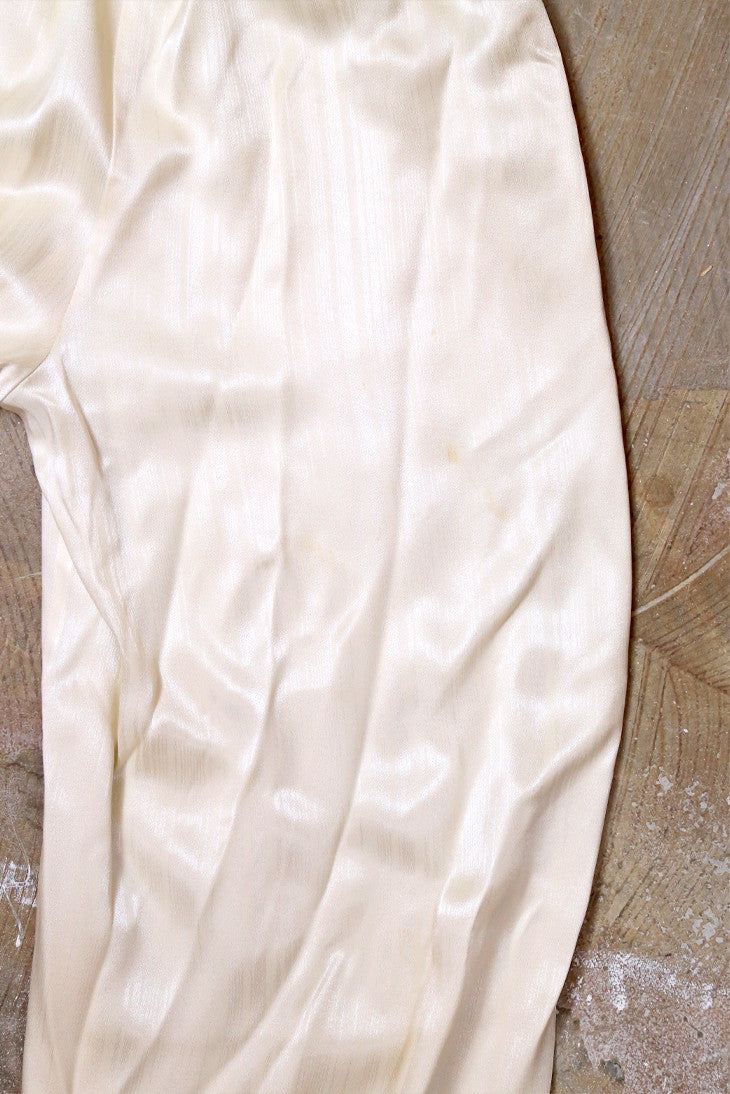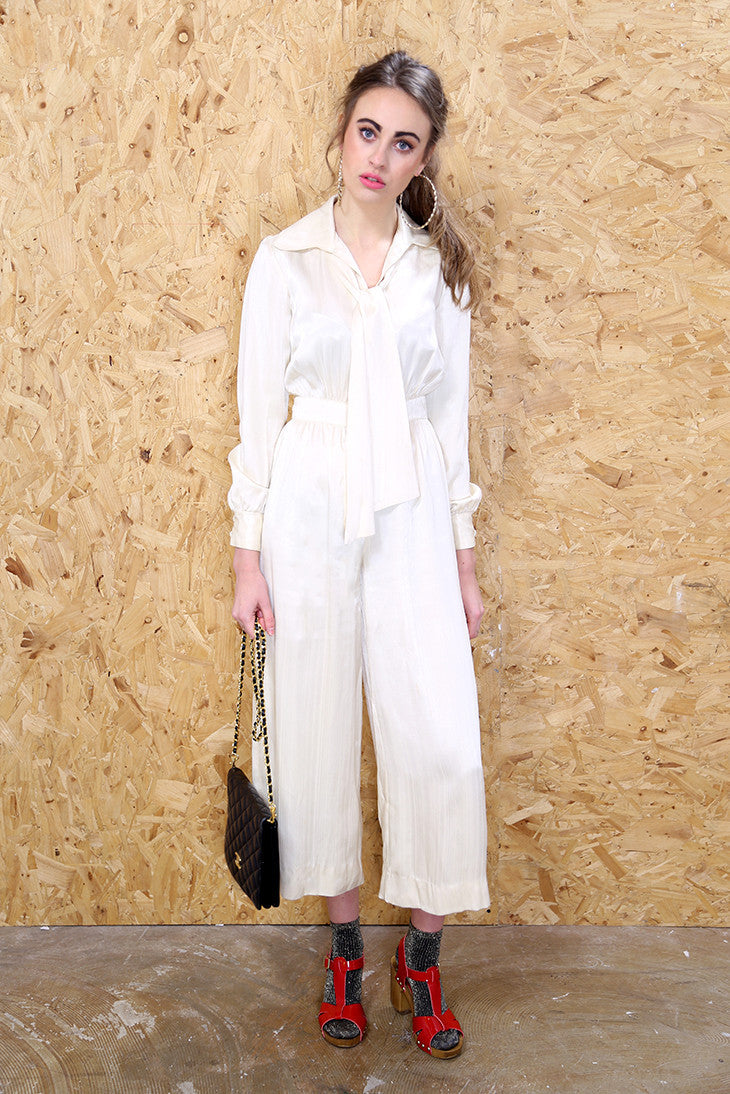 This jumpsuit’s reason enough to forgo a dress. A vintage item straight from the 70s, with a retro collar and pussybow detail at the neck. Made from shimmering pinstripe satin in cream losing classy style, this item features a front zipper fastening wide leg silhouette and buttoned cuffs.