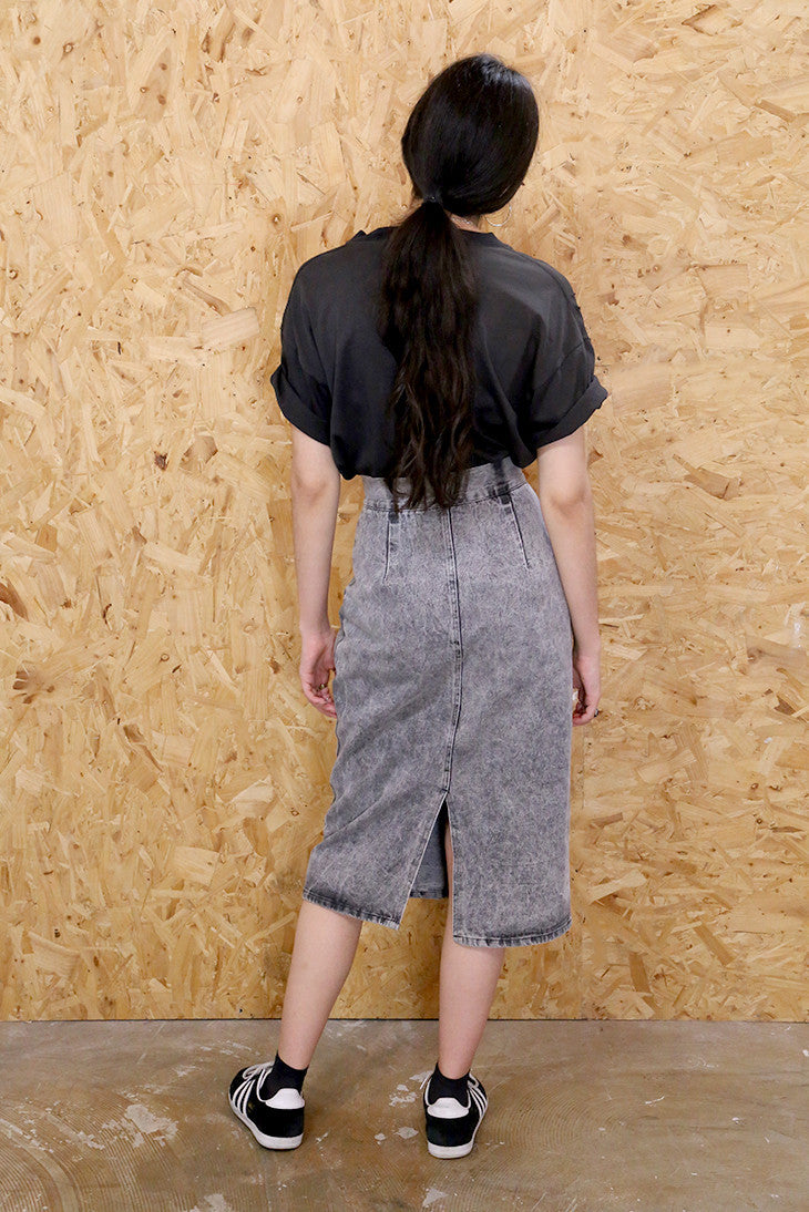 Pencil in an appointment with the 80s, our vintage midi skirt keeps things grungy in grey stonewashed denim. A high rise and flattering fit make this the perfect match for any modern day retro-love, particularly in this season's popular below-the-knee length. Features split at the centre back for freedom of movement and zipper fly fastening.