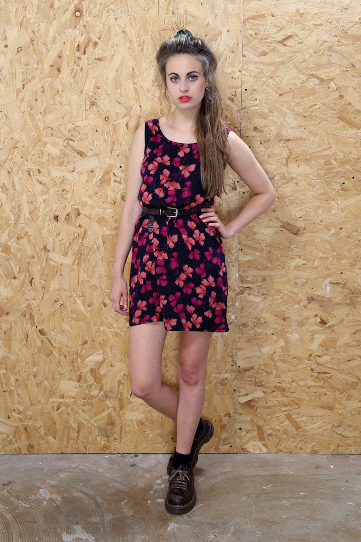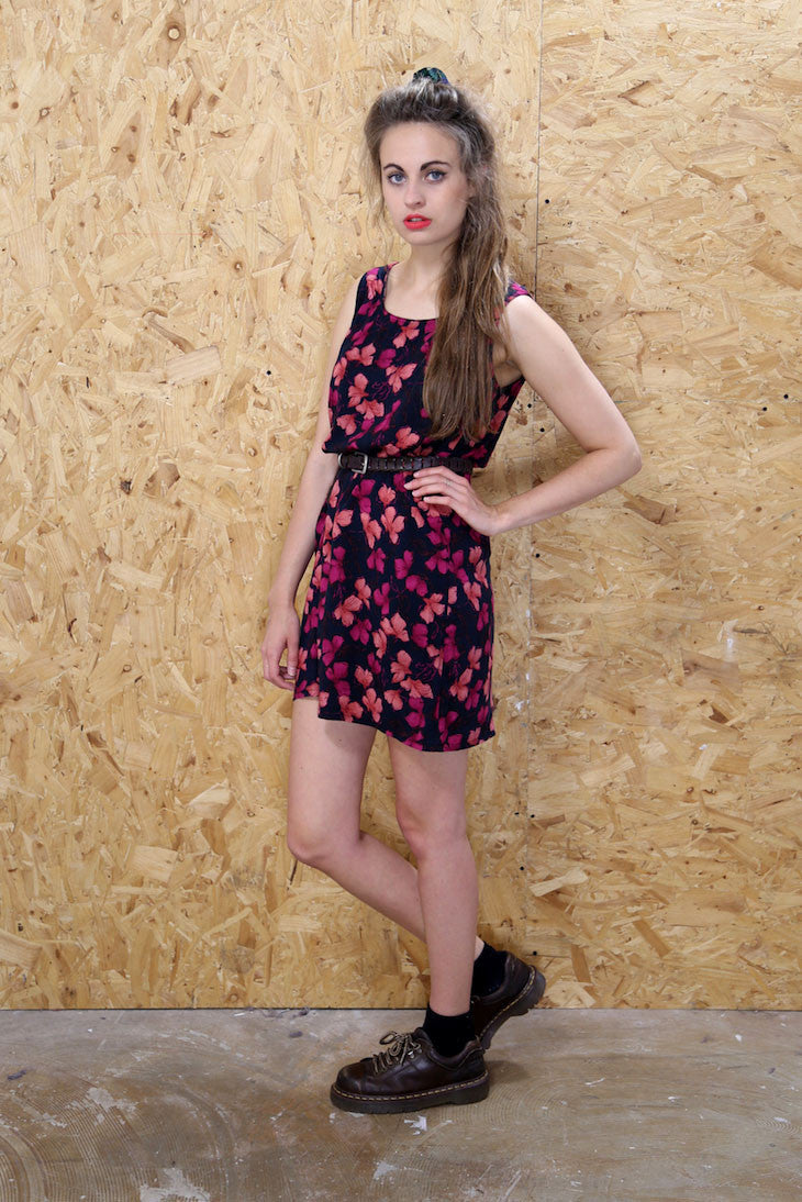 Black floral sleeveless loose fitting shift dress. Features scoop neck and all over pink floral print.