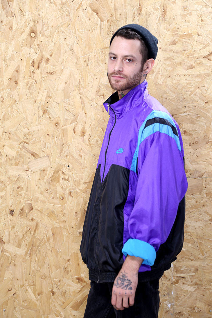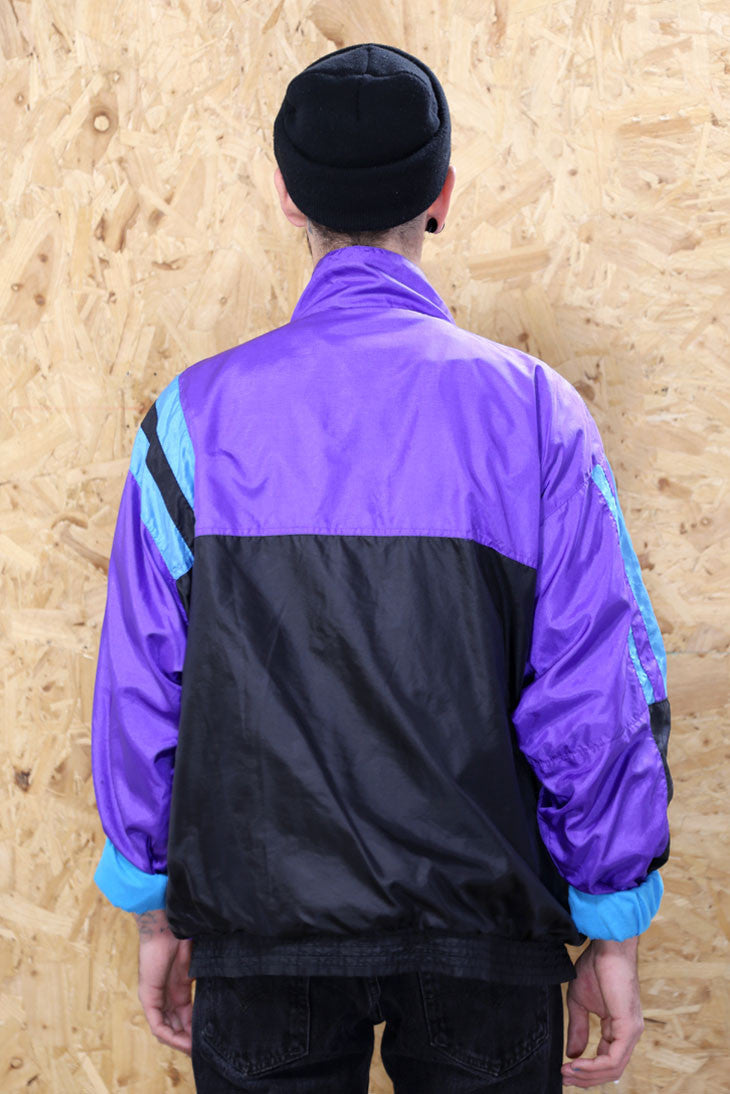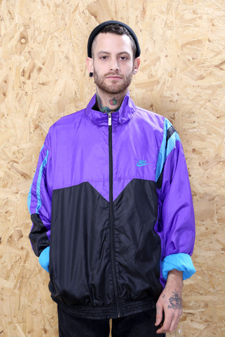 Lightweight sports windbreaker jacket by Nike in purple, with black and turquoise panelling. Features a zip closure and small embroidered brand logo.