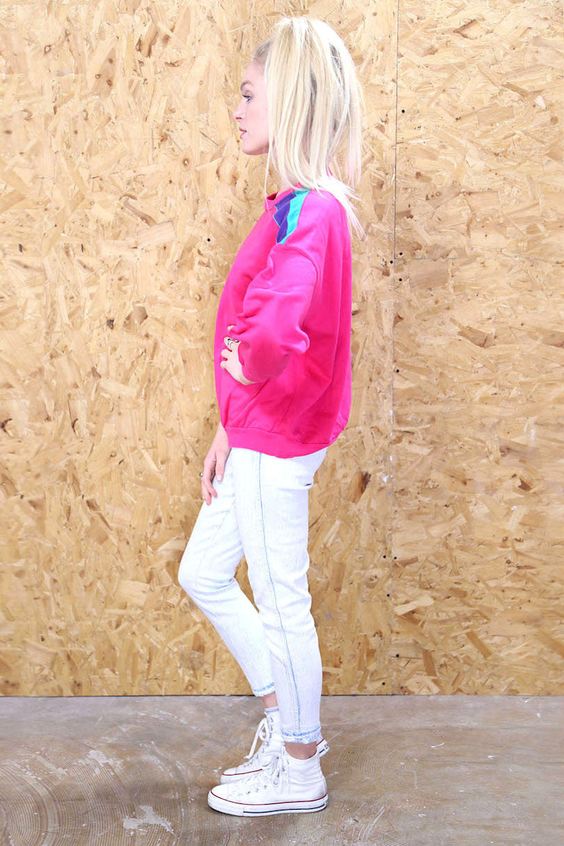 Retro sports sweater in bright pink with blue and turquoise shoulder panels.