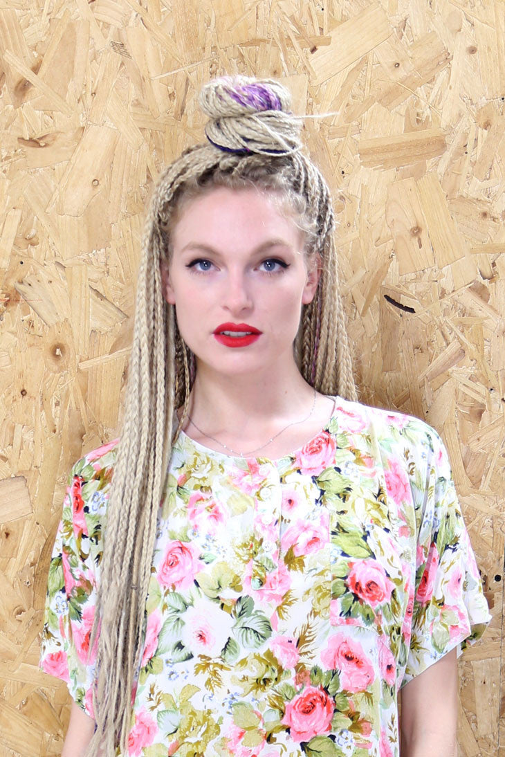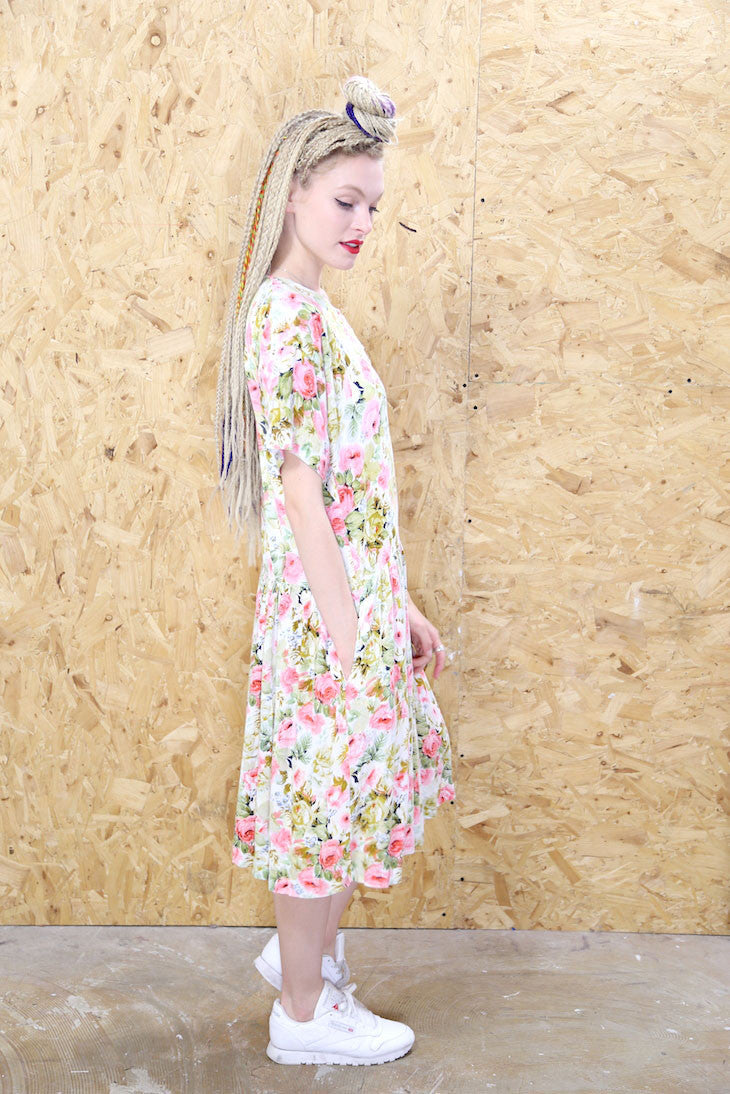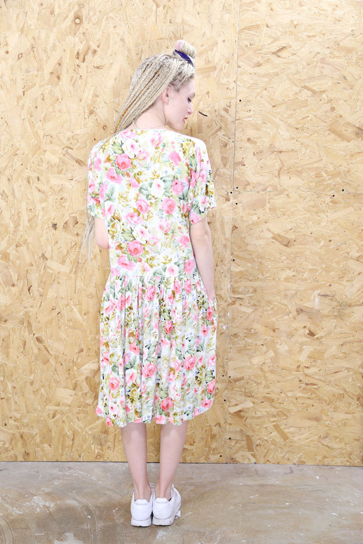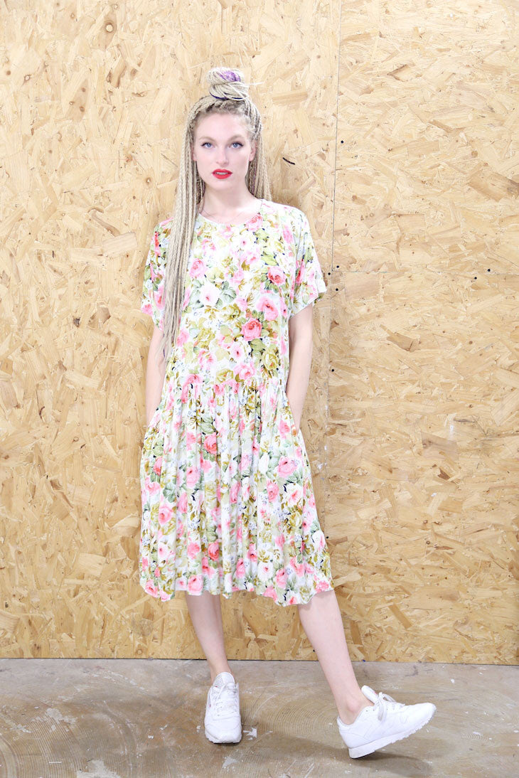 90s style loose fitting smock dress in pastel colours with an all over grungy floral print. Features pockets, babydoll waistband and button details.