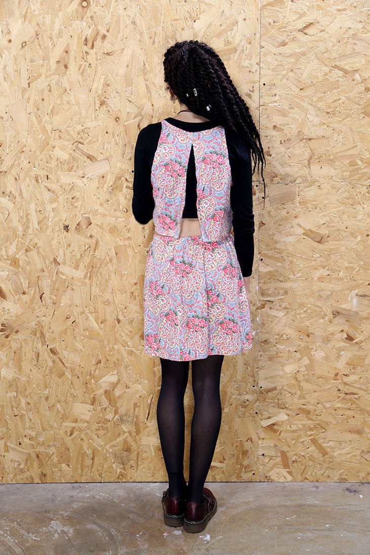 Co-ord with an open back crop top and matching skater skirt, reworked from a vintage item by our Loot Label design team. Features a dainty floral print in pastel blue, yellow and pink, the skirt has an elasticated waistband.